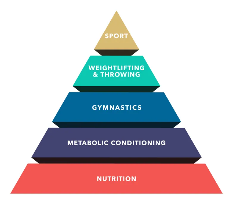 - I korta drag är CrossFit högintensiv och varierad konditions- och styrketräning. Det finns en CrossFit-pyramid som gjordes för länge sedan och den beskriver hur man bör tänka när man utövar CrossFit.